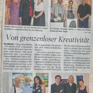 Der Galerist und Kurator Bertrand Kass präsentierte in der diesjährigen Sommerausstellung Kunst aus Luxemburg, Deutschland und Österreich, die in den altehrwürdigen Räumlichkeiten der kaiserlichen Hofburg ein besonderes Ambiente fand. Neben Gabriel Anker, Regina de Witte, Beatrix Eifes, Carla Romana Fantini, Marc Graas, Hedwig Meinhart, Sebastian Toledo, und Madlen Wrobel stellte Jaru insgesamt acht neuere Werke aus seinem Portfolio aus und erntete großes Lob.