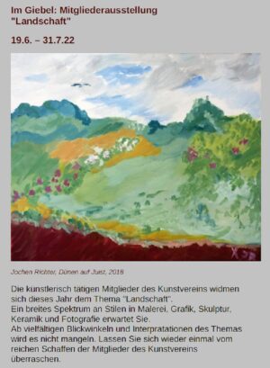 Vom 19.Juni bis zum 31. Juli 2022 fand die Ausstellung der Mitglieder des Kunstvereins Fischerhude im Giebel des Buthmanns Hofs statt.